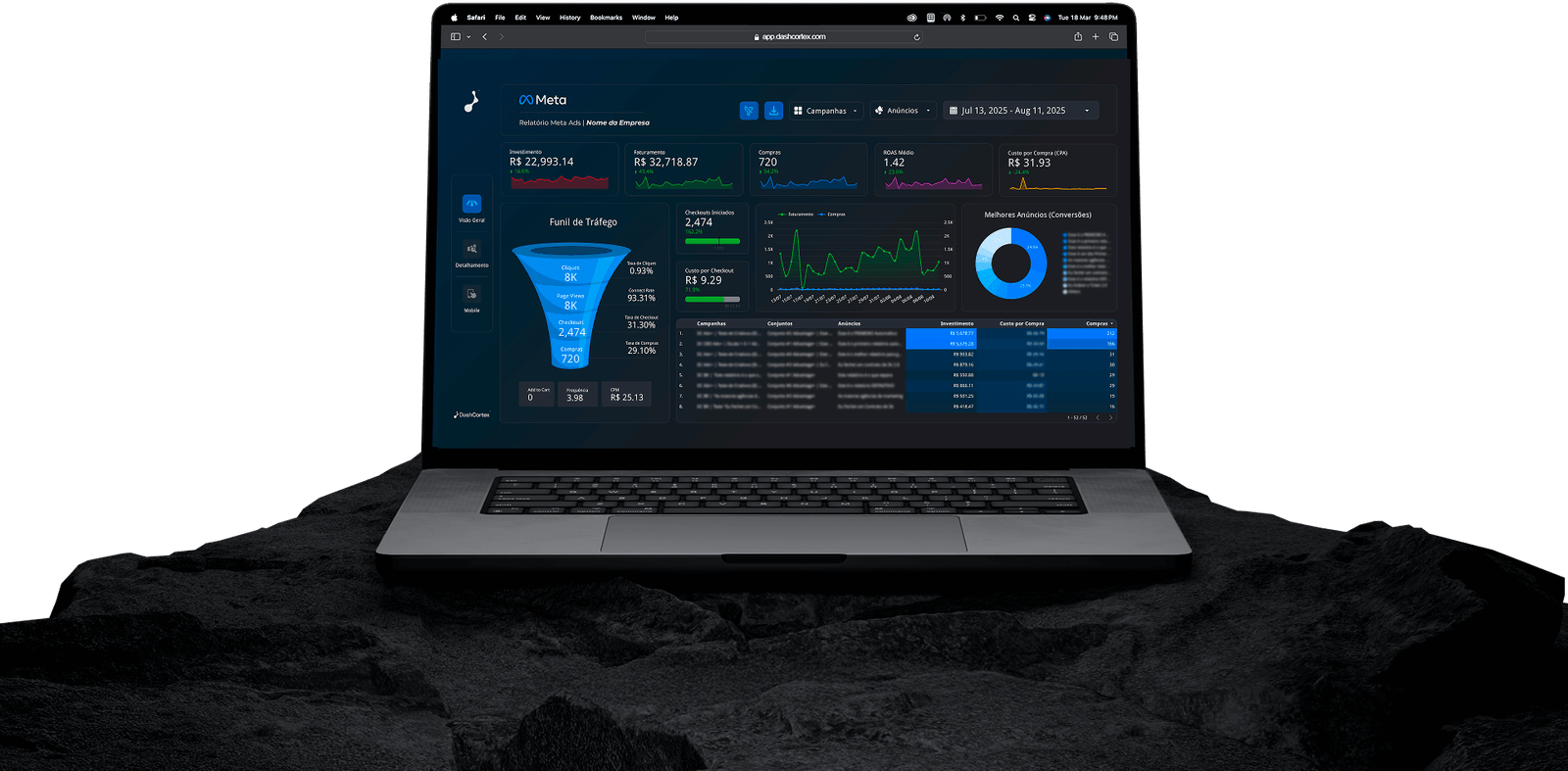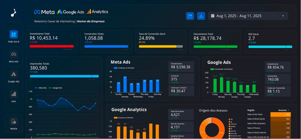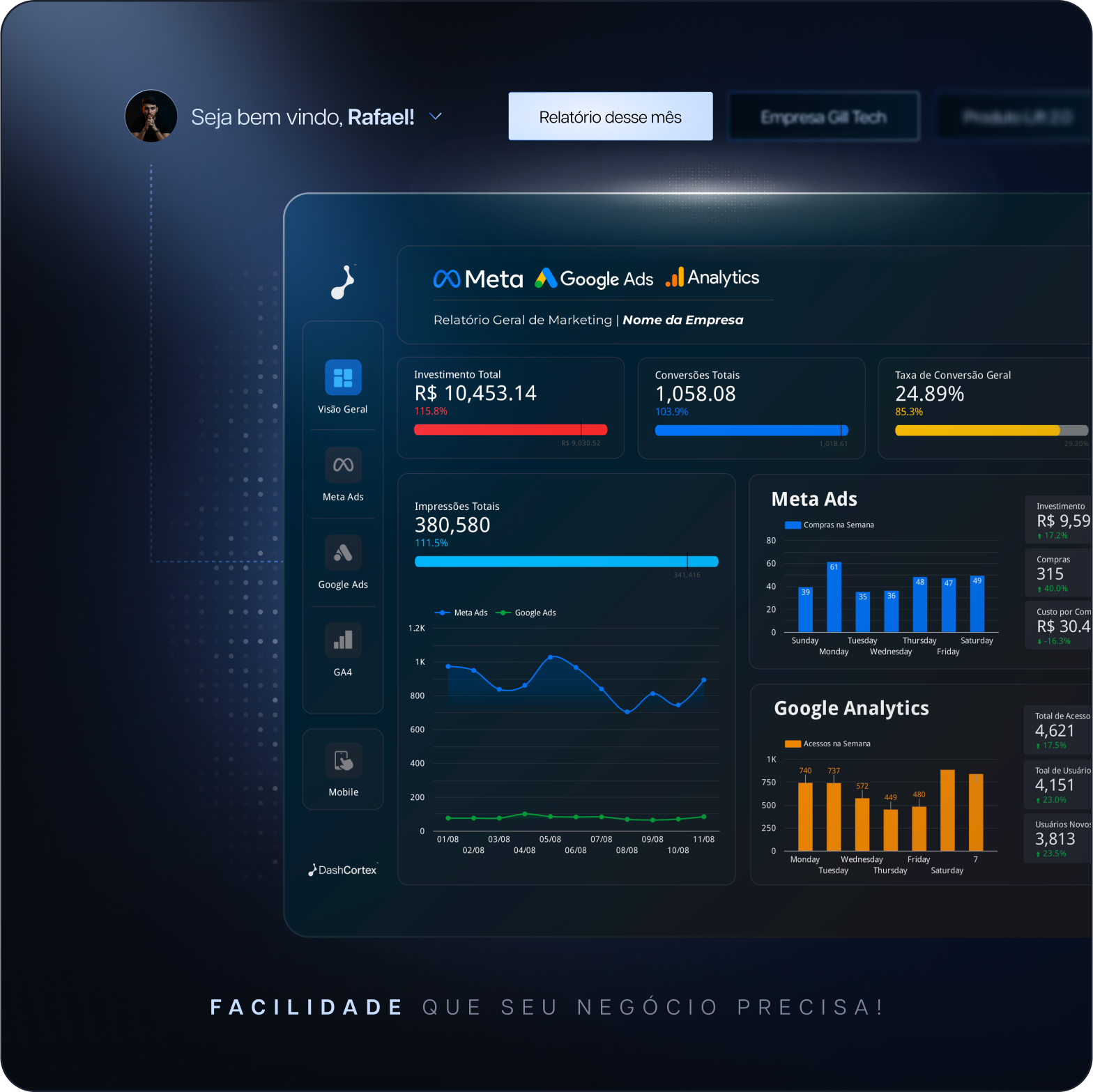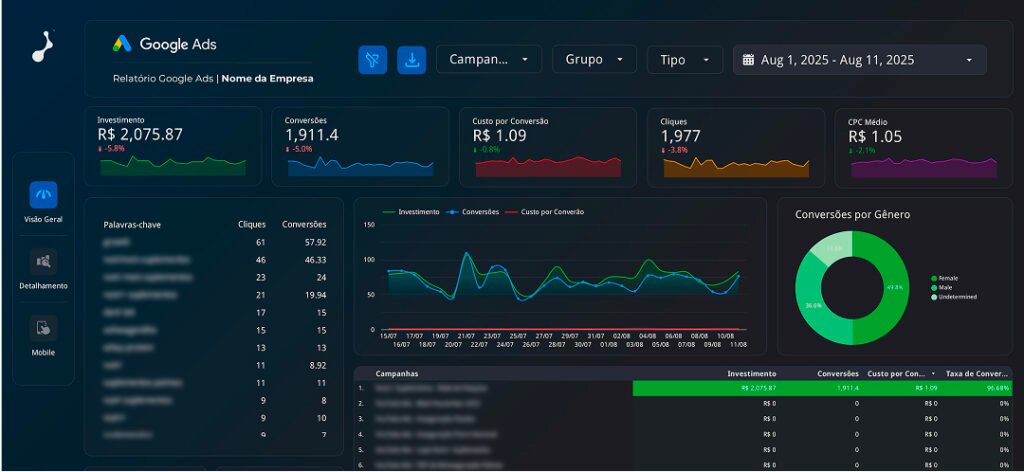 Os Relatórios DashCortex utilizam o Looker Studio, uma plataforma do Google. Toda a estrutura já está pronta, basta conectar suas contas de anúncios, analizar os resultados ou compartilhar com seu cliente.