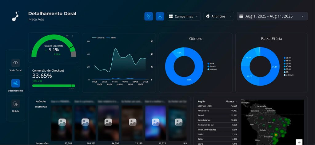 Vista general, desglose, embudo de tráfico, línea de tiempo, imágenes de los creativos, datos demográficos y mucho más.